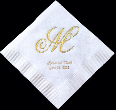 White Beverage Napkins to enhance your wedding ensemble. Coordinate with any matching design. Napkins may be imprinted in shiny or flat foil colors. Size: 4 3/4" x 4 3/4". Shown with Gold Foil, Lettering Style No. 19 only, and your choice of design. Shiny Foil Colors: Gold, Silver, Claret, Sage, Purple, Periwinkle and Forest Green. Flat Foil Colors: Rose, Burgundy, Navy and Black