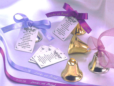 Add happy music and fun to your reception with these cute gold and silver-tone bells! Use our personalized favor ribbons as shown to attach the poem card to the bell. Bell measures 1 1/2" and there are 24 bells with cards in each display box. Ribbon is not included.