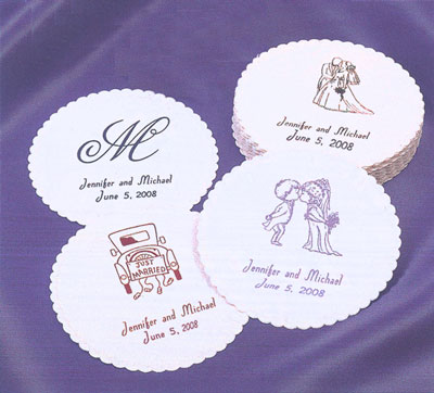 These soft white coasters with water proof backing are perfect when celebrating your special day. Prices include hot foil stamping of two lines of copy or two lines plus a design from our selection. Several Foil Colors are available, either in Shiny Foil or Flat foil. Size 3 1/4" diameter. Quanitity of 50.