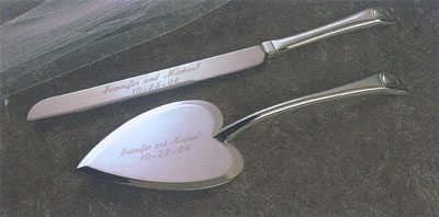 Silver Plated Heart Server and Knife Set. Romatic is the feeling of this knife and heart shaped server with embossed hearts on each handle. Server Size 10 1/2", Knife size: 12 1/2". We will personalize them with your first names and wedding date. Knives and Servers are sold as sets only
