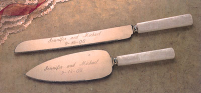 White Knife and Server. This popular knife and server features simulated White Mother Pear handles. Server size 10", Knife size: 12". We will personalize them with your first names and wedding date. Knives and Servers are sold as sets only